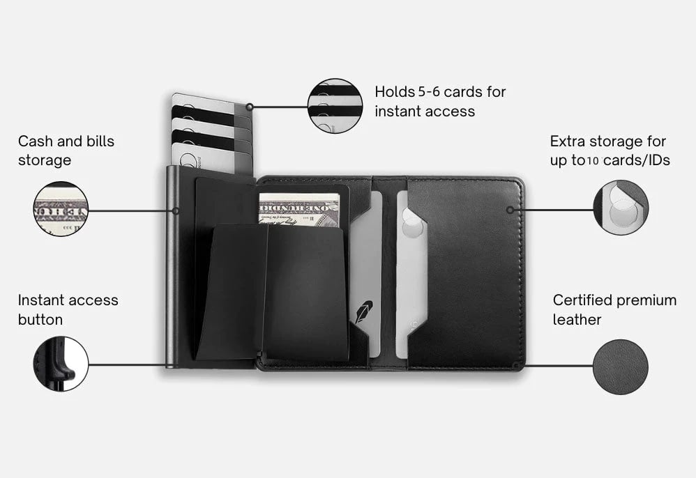 You will have more space than ever with the new slim profile design. It can seamlessly holds up to 5-6 cards & 20 Bills at a fraction of the size of a traditional wallet. And with the advanced trigger mechanism. just a push of your fingertip to select the card of your choice instantly. It's a reimagination of what the modern wallet can be